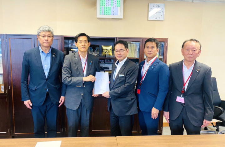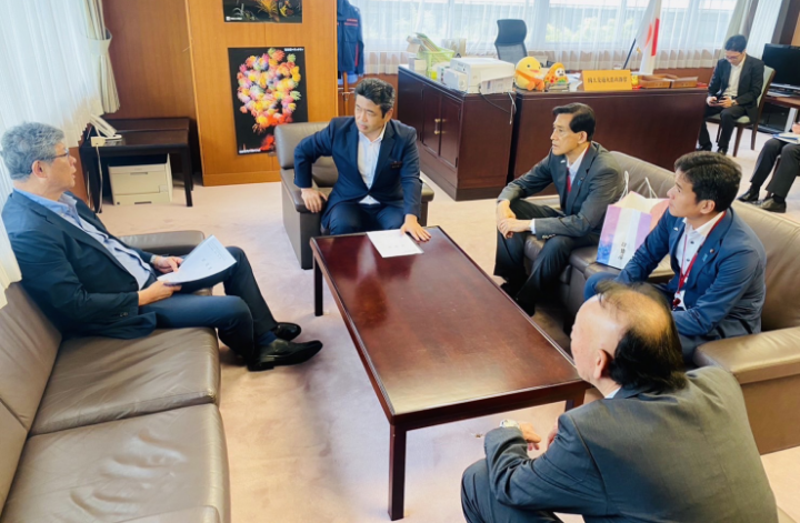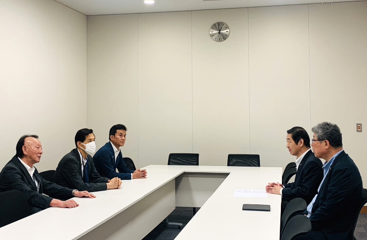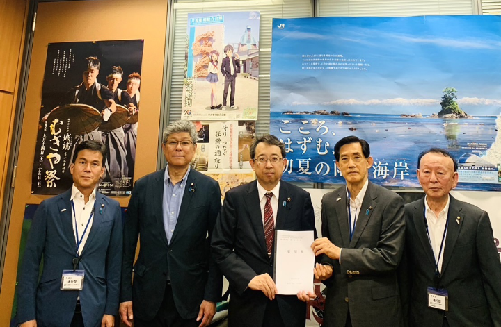 松崎晃治小浜市長、藤田靖人小浜市議会議長、小沢長純北陸新幹線早期全線開業特別委員長が訪問され、小浜市と小浜市議会から北陸新幹線の早期開業についての要望書をいただきました。