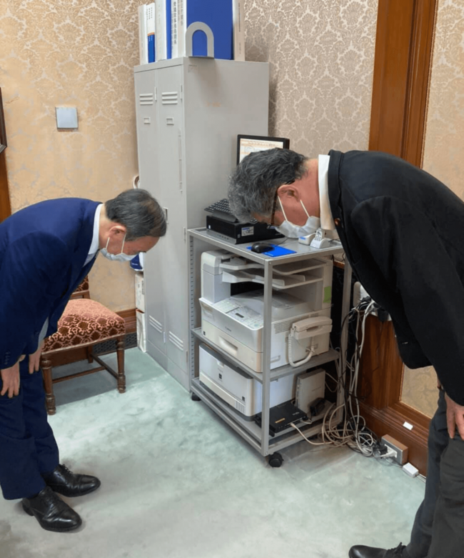 第204回国会が閉会。菅総理が議運委員長前室に挨拶に来てくれました。握手が出来ないのでどうしてもこうなってしまいます。