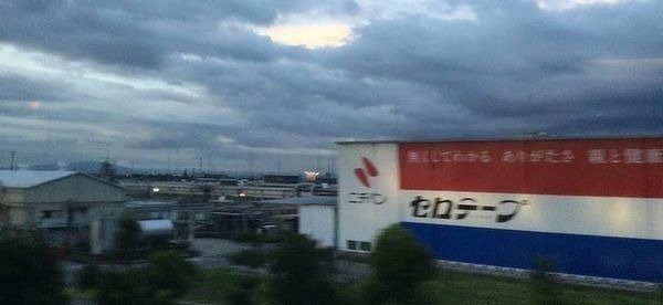 ついに撮れたシャッターチャンス!東海道新幹線、三河安城辺り、東京に向かって左側の線路沿い。「なくしてわかるありがたさ、親と健康とセロテープ」。セキスイの社屋の壁です。
